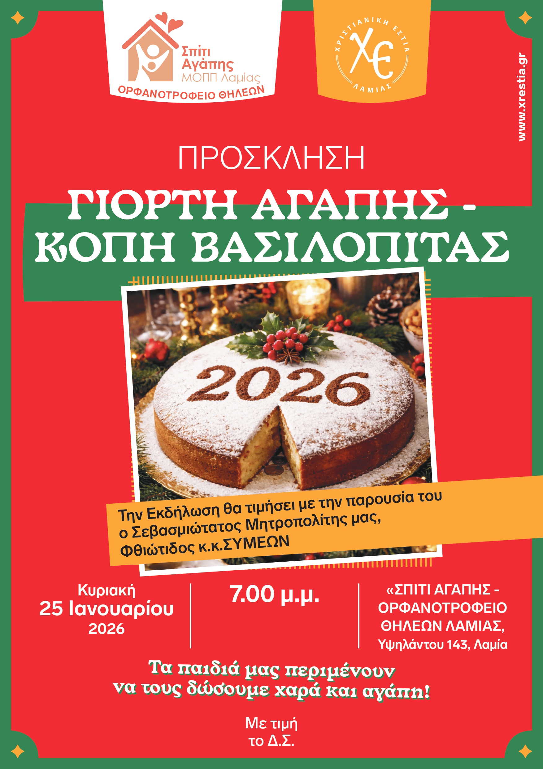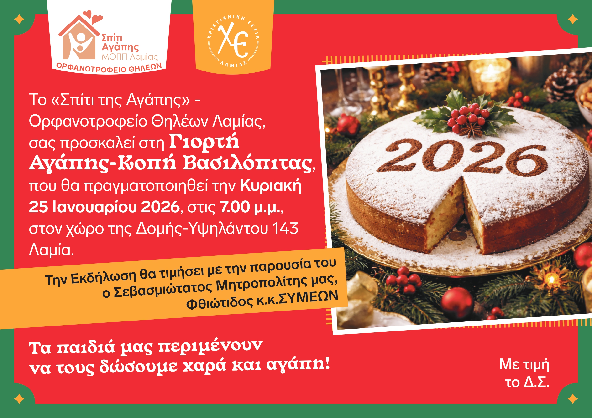 Σας προσκαλούμε την Κυριακή 25 Ιανουαρίου 2026 στις 7.00 μ.μ. στην γιορτή αγάπης-κοπή Βασιλόπιτας που θα πραγματοποιηθεί στο «Σπίτι της Αγάπης», Ορφανοτροφείο Θηλέων Λαμίας, Υψηλάντου 143.