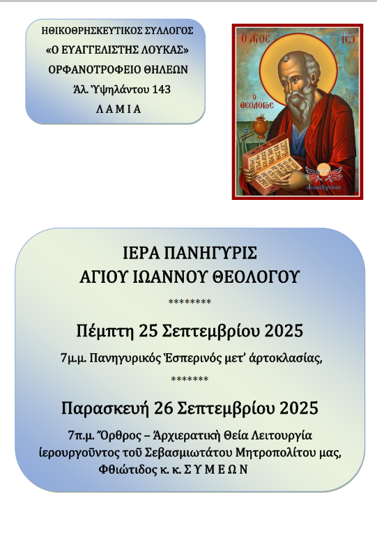Σας προσκαλούμε στην Ιερά Πανήγυρη του Αγίου Ιωάννου του Θεολόγου που θα πραγματοποιηθεί με την ευλογία και την παρουσία του Σεπτού Ποιμενάρχου μας, Σεβασμιωτάτου Μητροπολίτου Φθιώτιδος κ.κ. Συμεών.