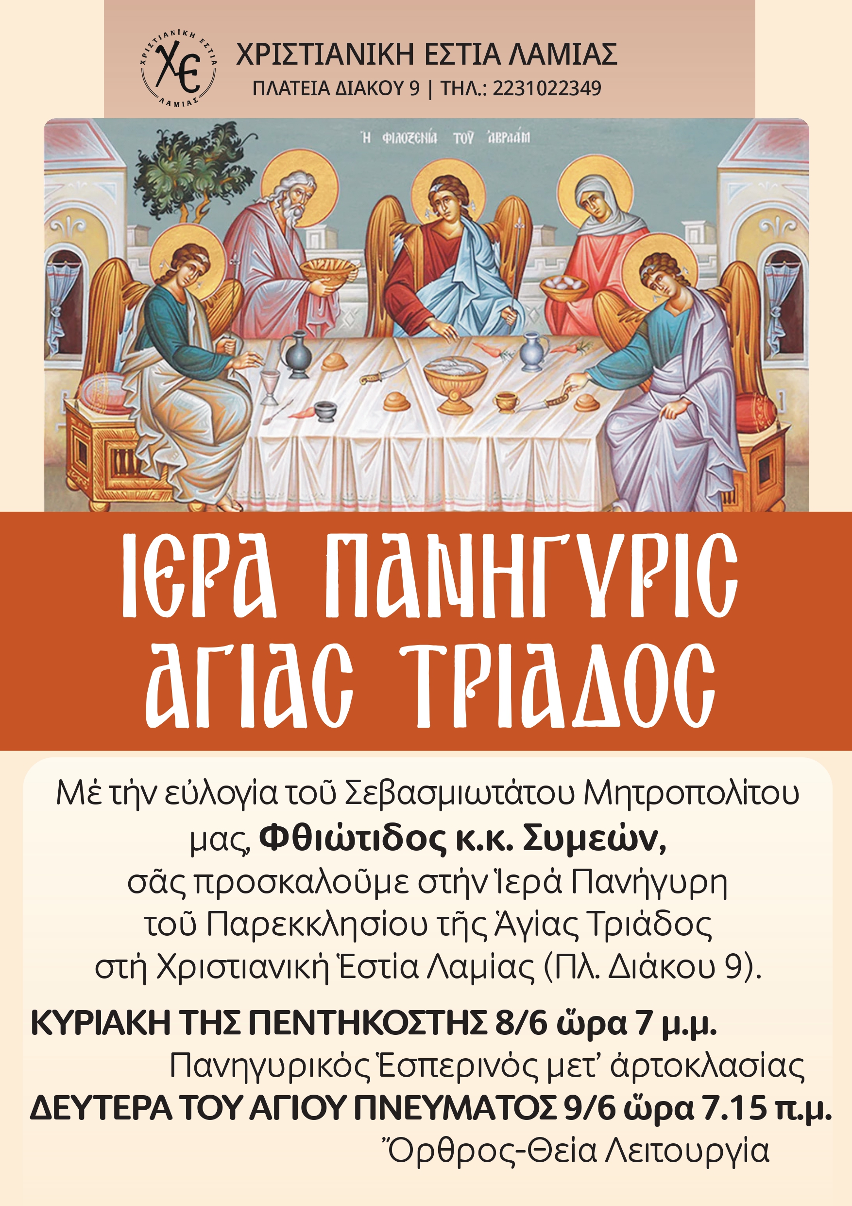 Μέ τήν εὐλογία τοῦ Σεβασμιωτάτου Μητροπολίτου μας, Φθιώτιδος κ.κ. Συμεών, σᾶς προσκαλοῦμε στήν Ἱερά Πανήγυρη τοῦ Παρεκκλησίου τῆς Ἁγίας Τριάδος στή Χριστιανική Ἑστία Λαμίας (Πλ. Διάκου 9).