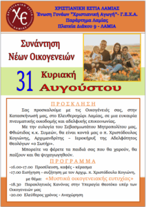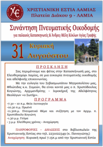Σᾶς προσκαλοῦμε στήν ὁμιλία πού θά πραγματοποιηθεῖ τήν Κυριακή 16 Φεβρουαρίου 2025 στίς 6 μ.μ. στή Χριστιανική Ἑστία Λαμίας μέ θέμα: «Τό ἀγωνιστικό φρόνημα στή
