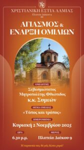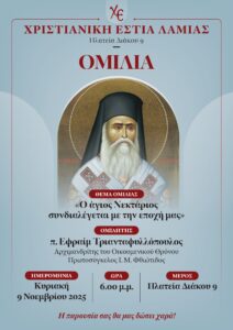 Σας προσκαλούμε στην ομιλία που θα πραγματοποιηθεί την Κυριακή 9 Νοεμβρίου 2025 στις 6 μ.μ. στη Χριστιανική Εστία Λαμίας με θέμα: «Ο άγιος Νεκτάριος συνδιαλέγεται